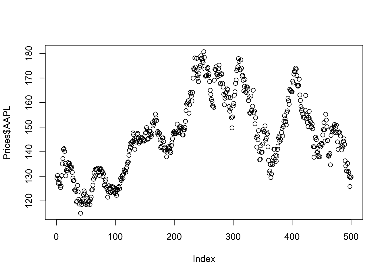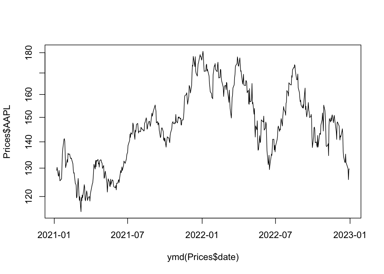 ```plot(ymd(Prices$date), Prices$AAPL, type='l', log='y')