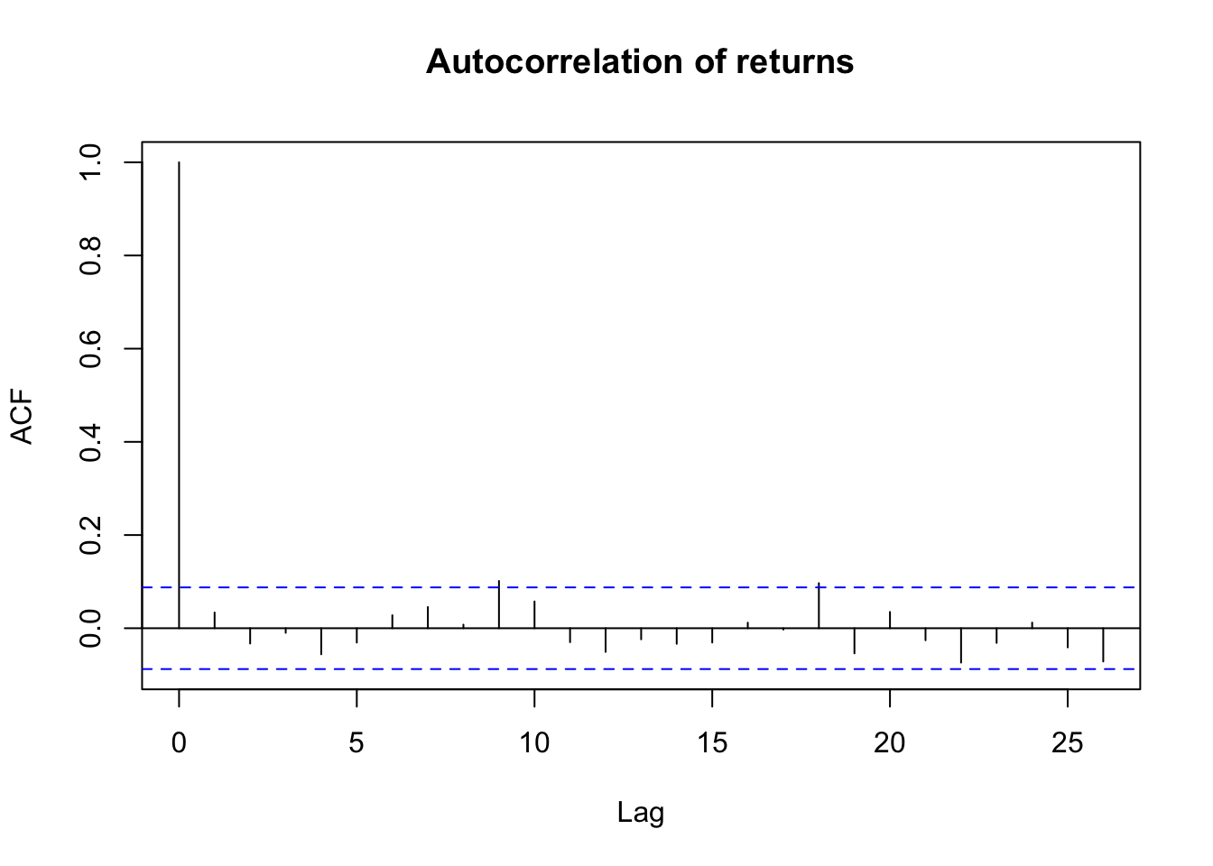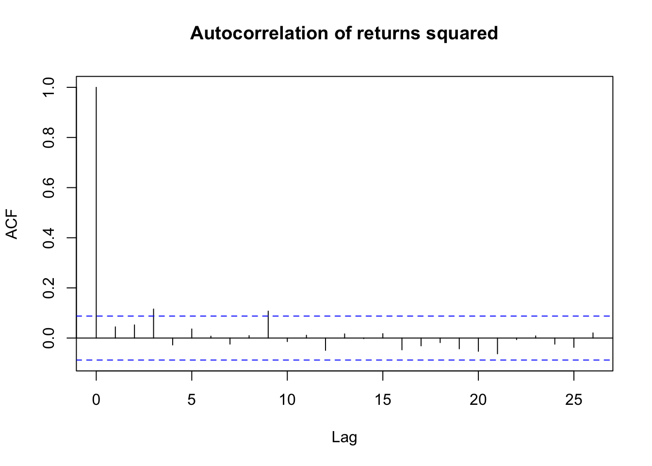 ```acf(y^2, main = "Autocorrelation of returns squared")