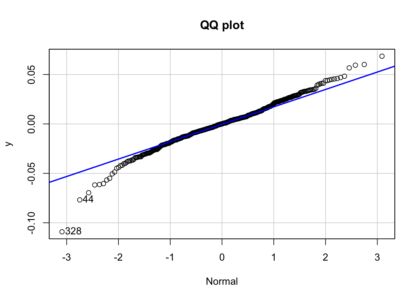 x = qqPlot(y, distribution = "t", df = 4, envelope = FALSE,