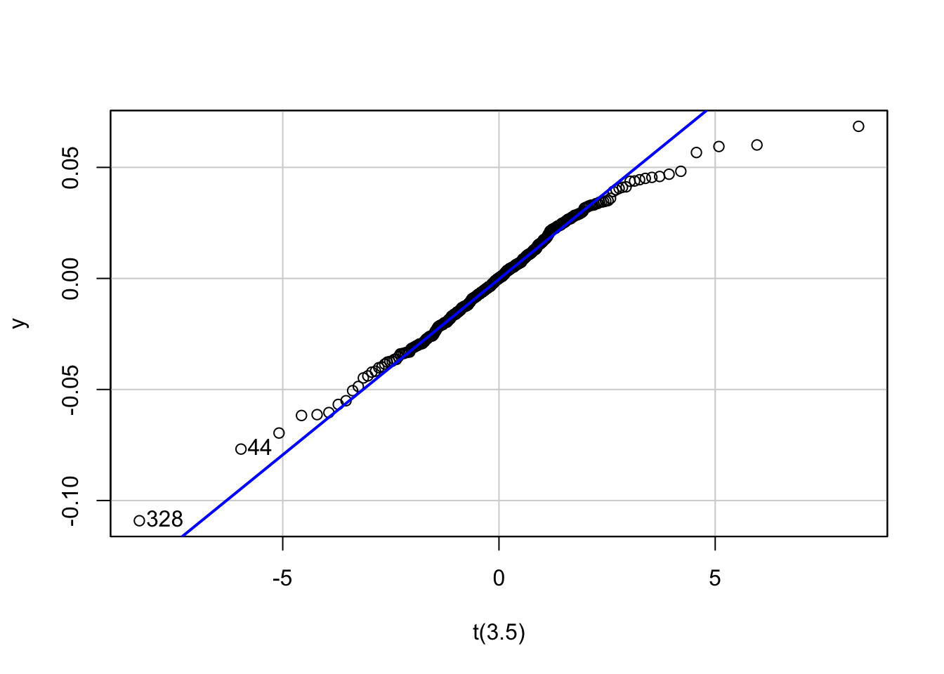 x = qqPlot(y, distribution = "t", df = 3.5, envelope = FALSE,