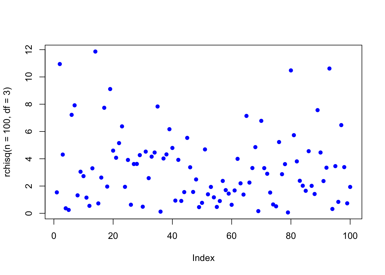 plot(rchisq(n = 100, df = 3), pch = 16, col = 'blue')
