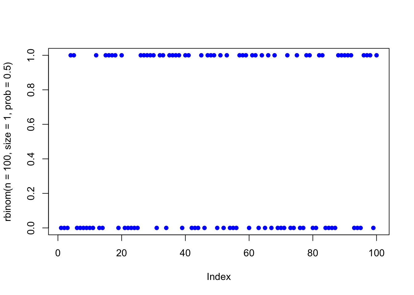 plot(rbinom(n = 100, size = 1, prob = 0.5), pch = 16, col = 'blue')