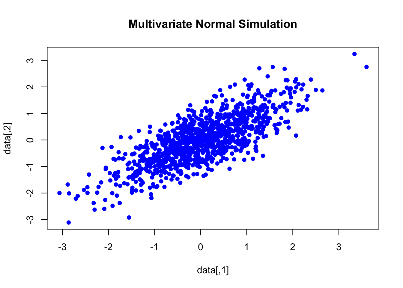 plot(data, col = "blue", pch = 16, main = "Multivariate Normal Simulation")