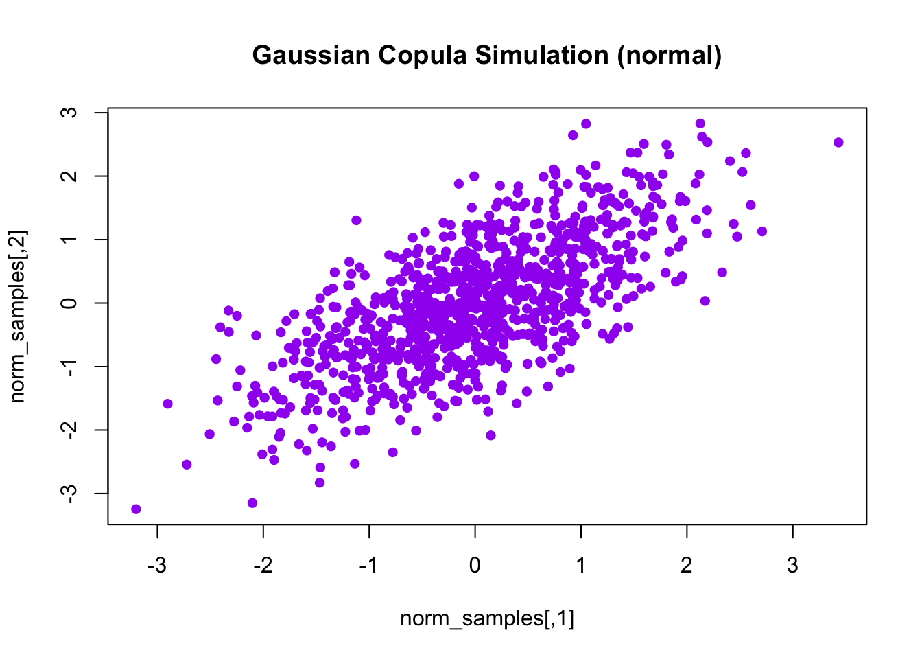 plot(norm_samples, col = "purple", pch = 16, main = "Gaussian Copula Simulation (normal)")