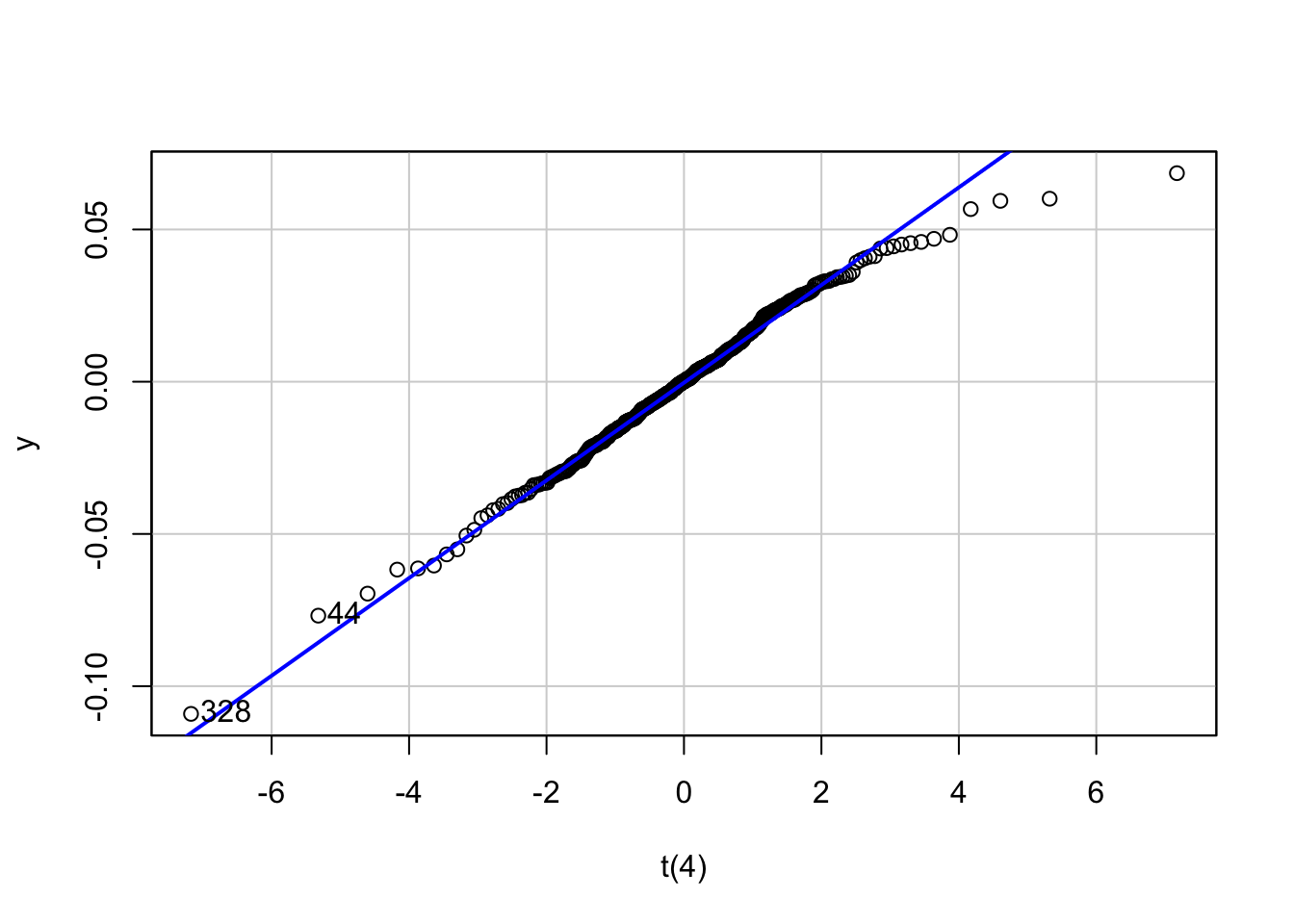 x = qqPlot(y, distribution = "t", df = 4, envelope = FALSE,