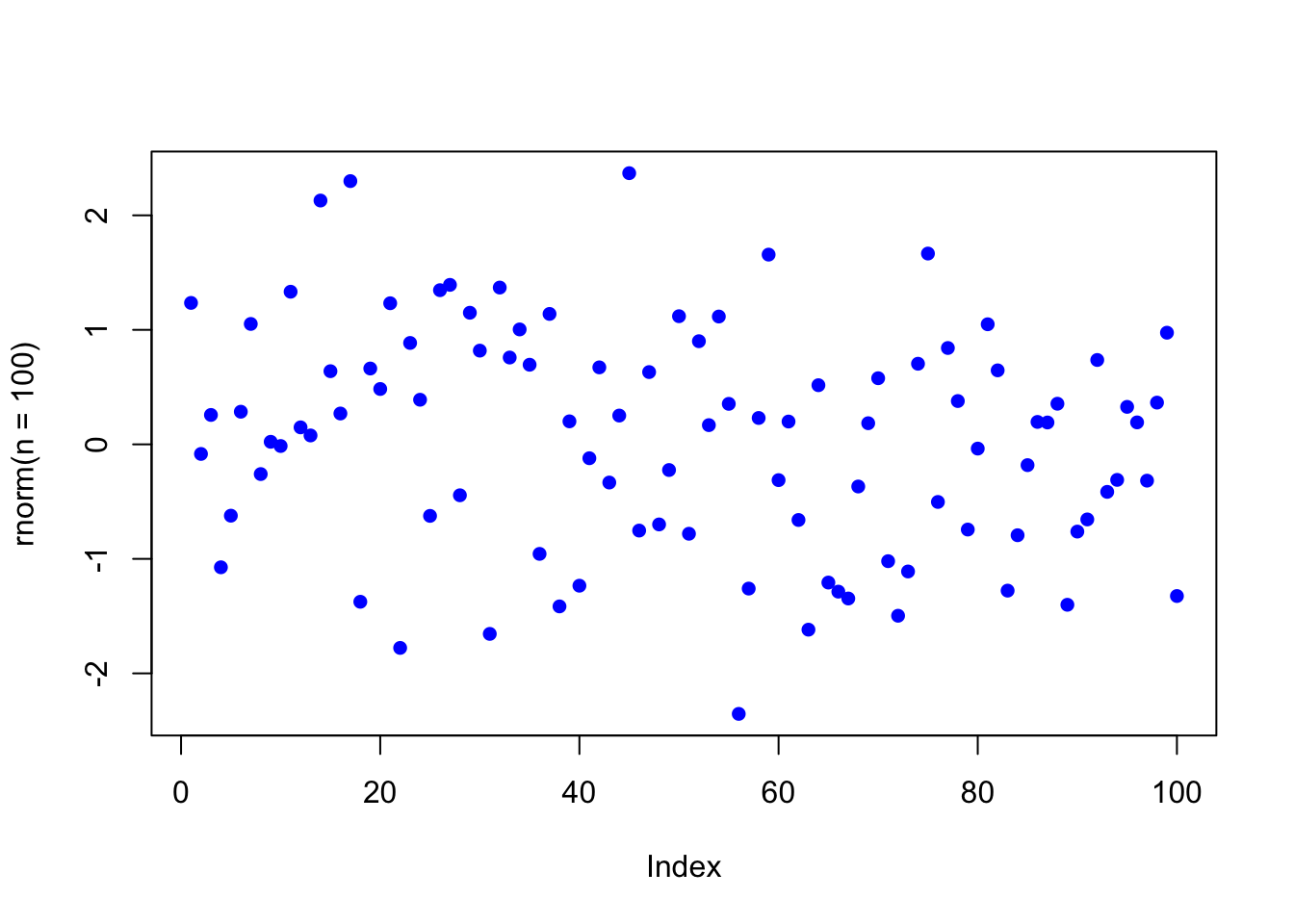 plot(rnorm(n = 100), pch = 16, col = 'blue')