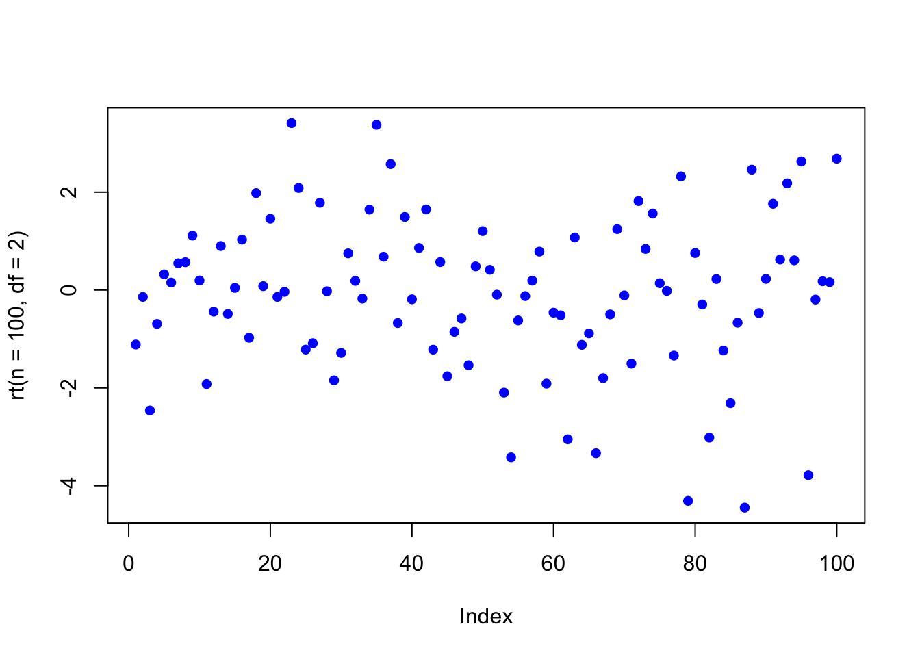 plot(rt(n = 100, df = 2), pch = 16, col = 'blue')