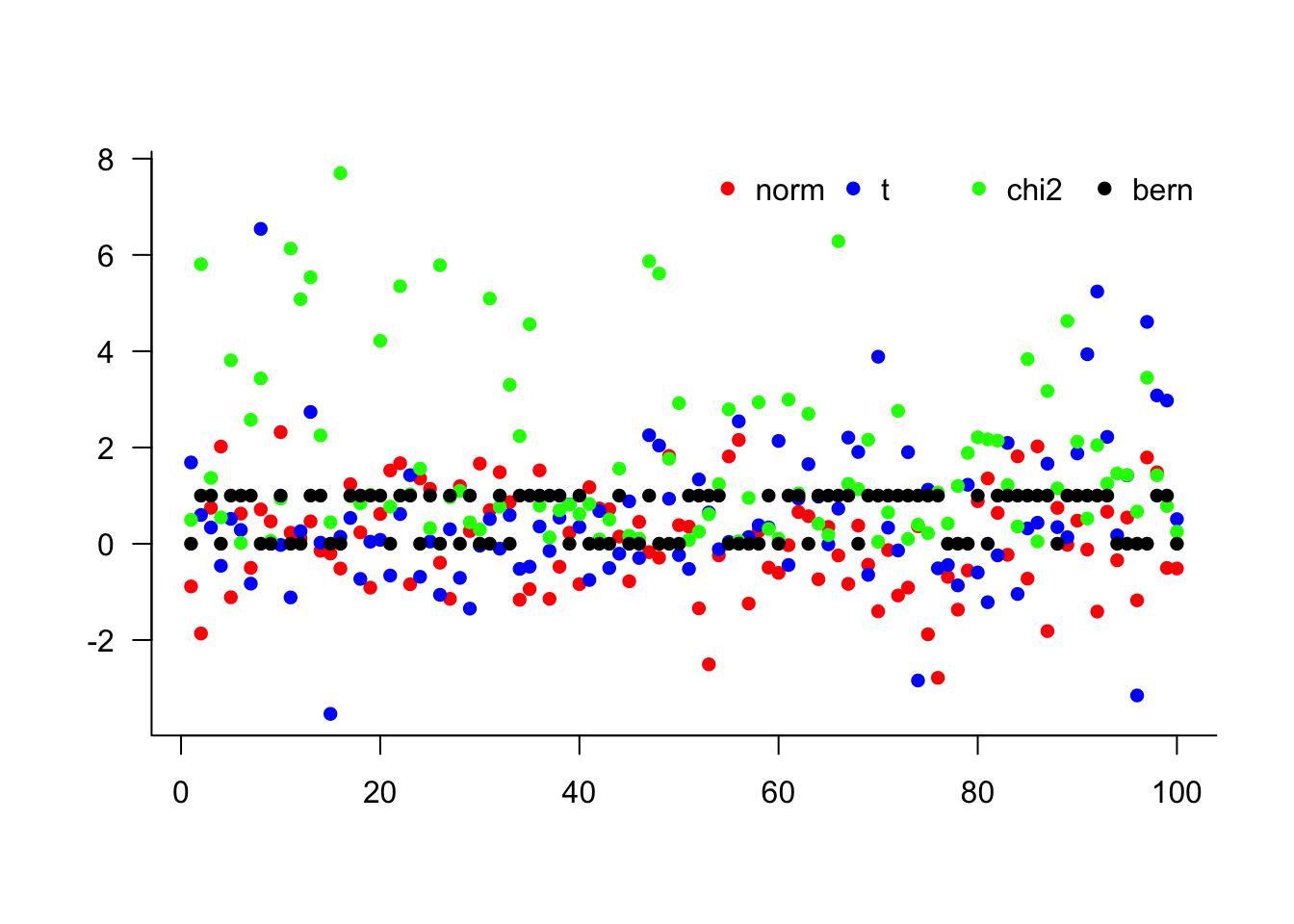 We will use several distributions, the normal (rnorm(n)), student-t (rt(n,df)), skewed student-t (rskt(n, df, gamma)), chi-square (rchisq(n,df)), the binomial (rbinom(n,size,prob)) and the Bernoulli, which is just rbinom(n, size = 1, prob = prob).
