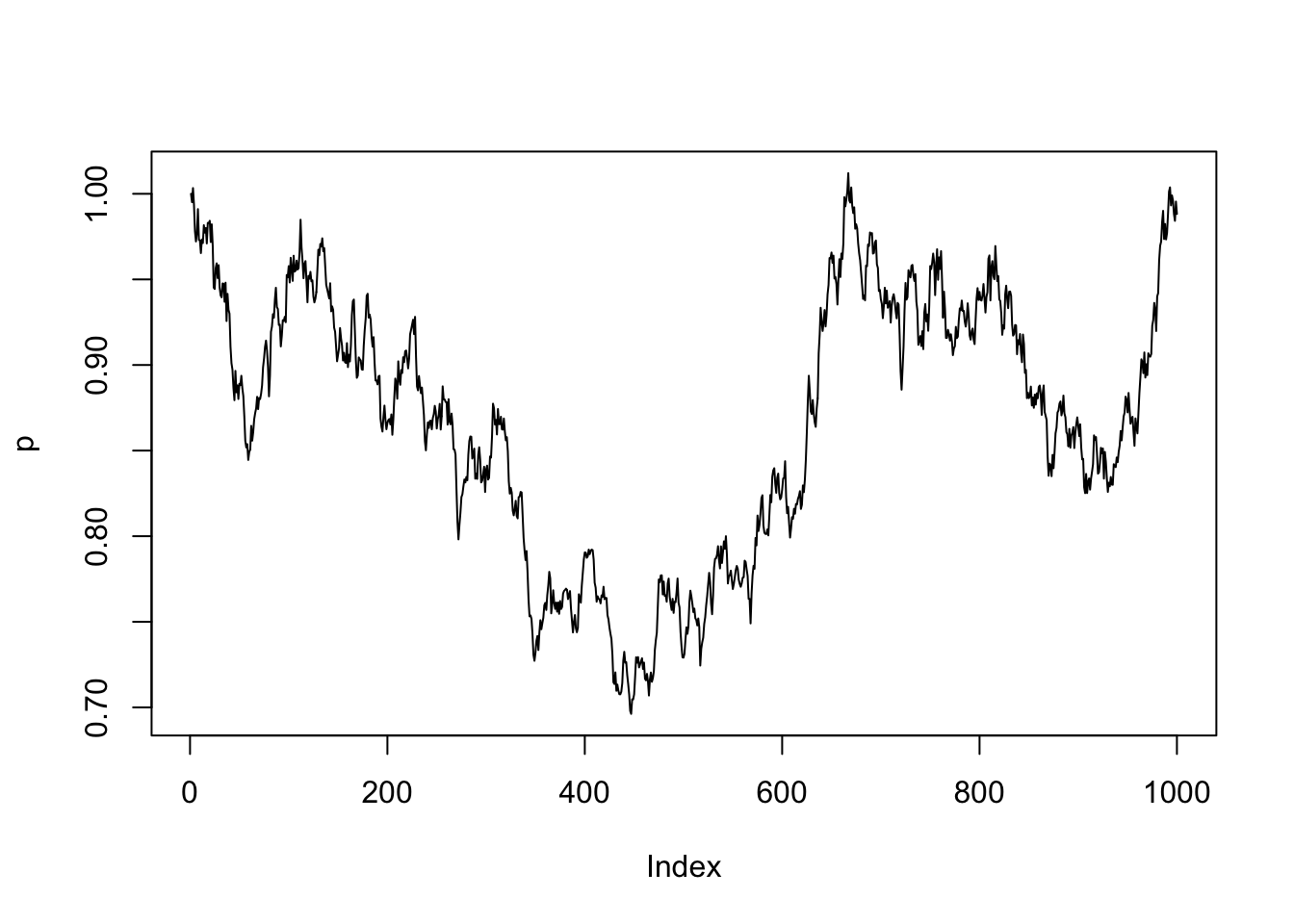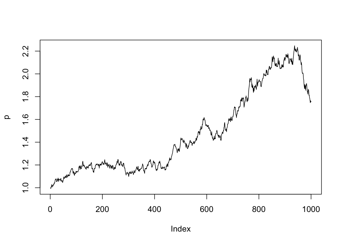 p = cumprod(rnorm(N, mean = 1, sd = 0.01))