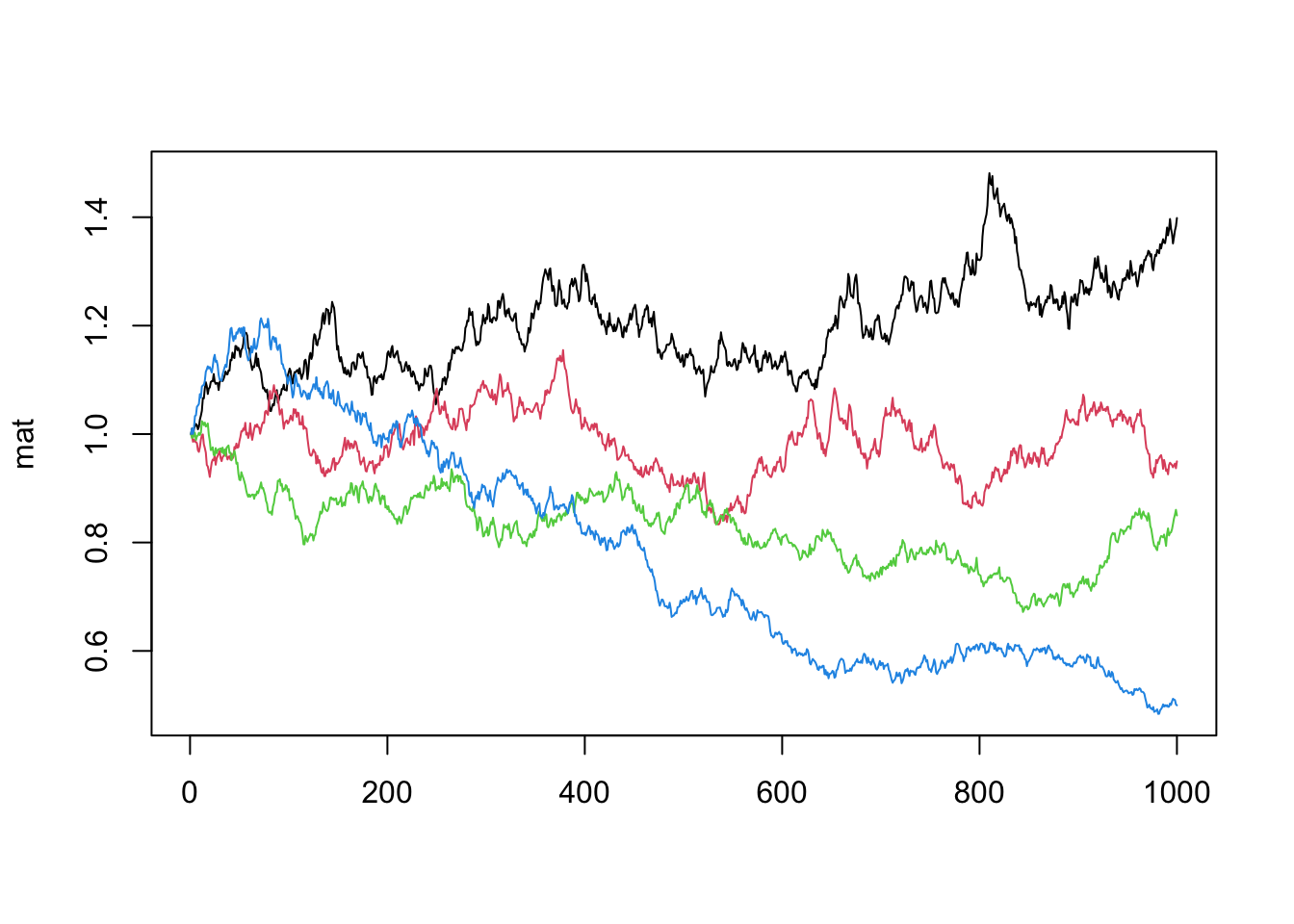 It is easy to simulate a random walk. In the example below, we set the mean to 0 and the standard deviation to 1%, which is approximately correct for most stock returns. We also use the IID normal distribution, which is not correct for stock returns.