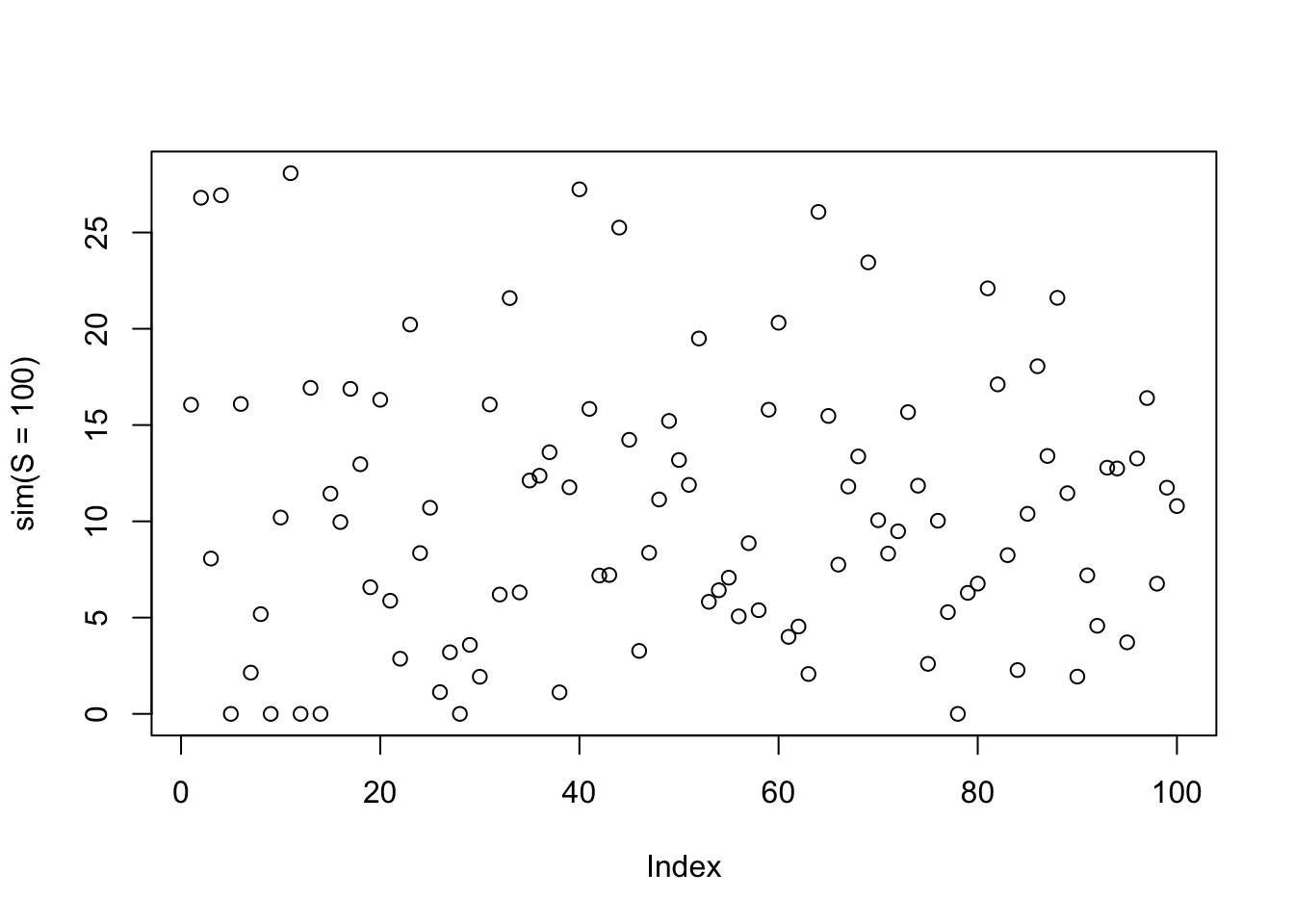 print(sim(S = 10)) [1] 16.054970 26.805763 8.065303 26.934463 0.000000 16.094585 2.140755