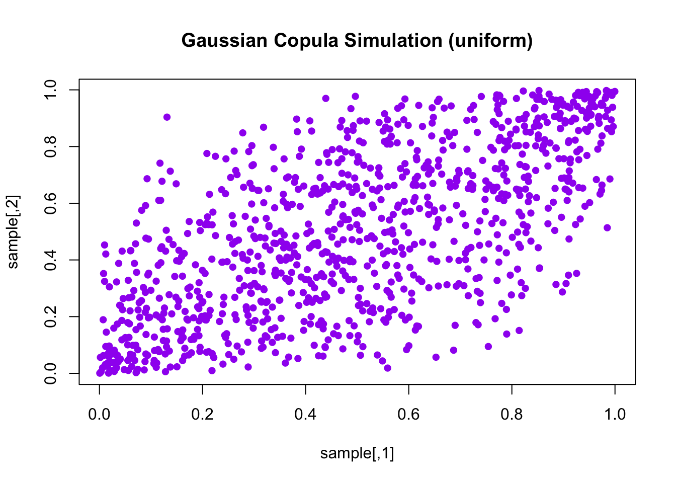 plot(sample, col = "purple", pch = 16, main = "Gaussian Copula Simulation (uniform)")