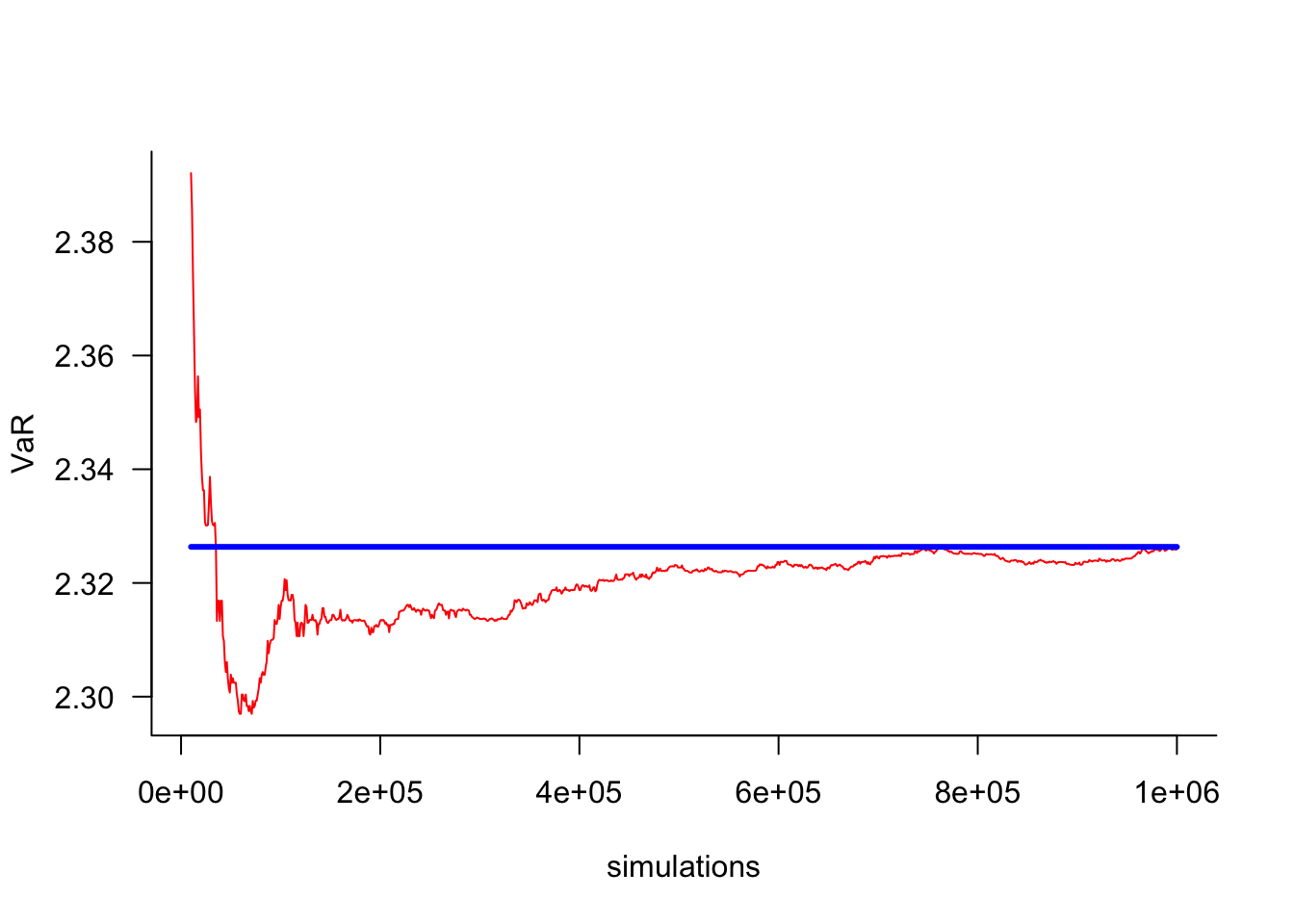 Since we know the true VaR in cases where we do not have the option, we can easily compare the true number to the one obtained by simulations. As the number of simulations increases, these two values should converge. And if they do not, we have done something wrong. We can also use this to ascertain how many simulations we need.