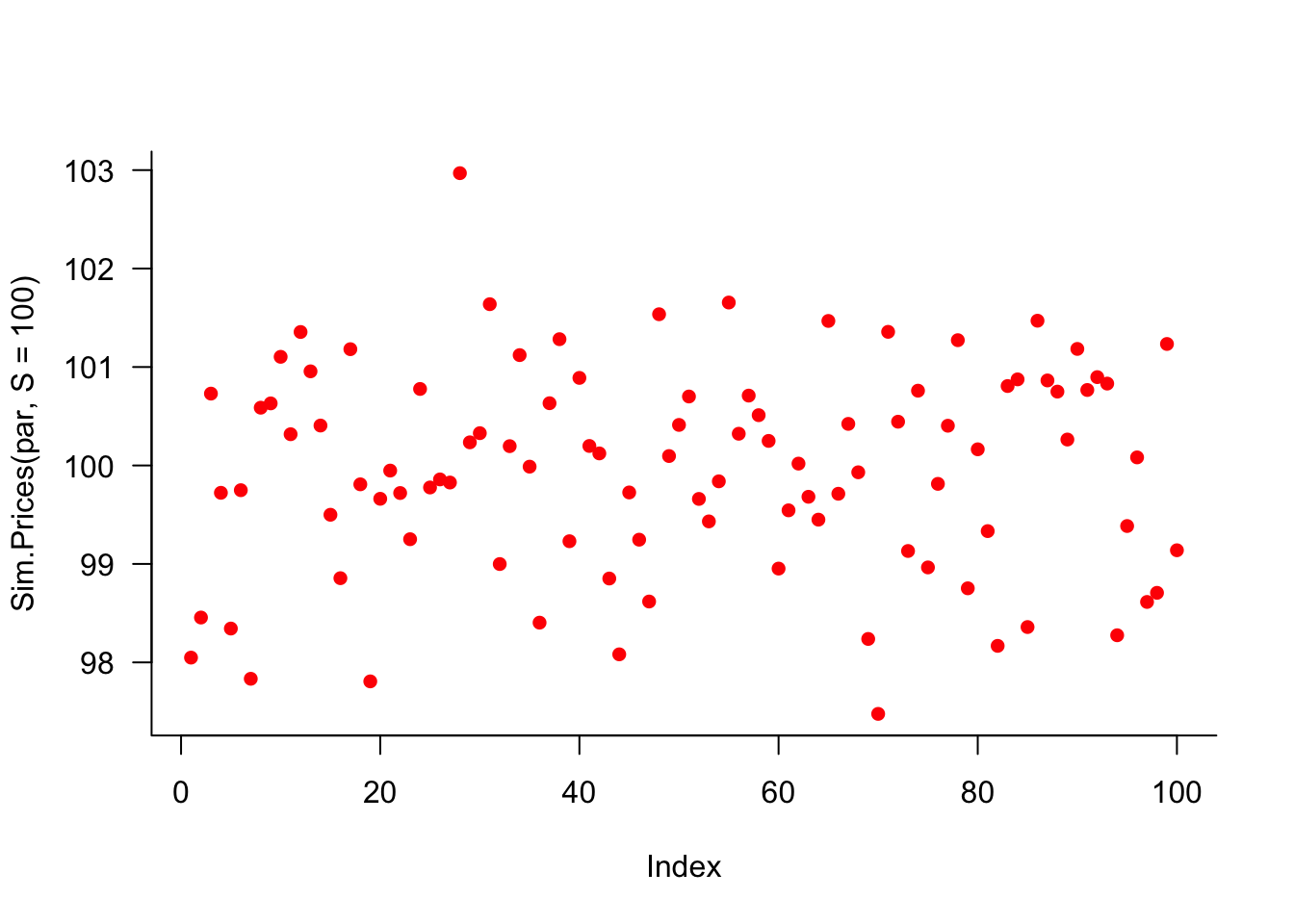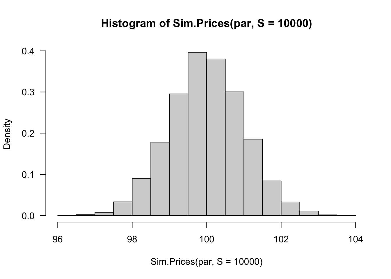 We create the function Sim.Prices(par) to implement the simulation. It takes the par list as an argument and returns a vector of simulated returns. If necessary, we could modify it to also return the Returns. It would also be straightforward to modify it to include other distributions besides the normal and even more advanced mean.