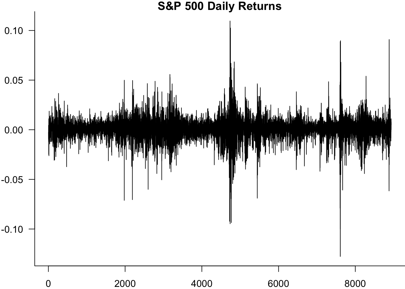 plot(sp500$y,type='l',las=1,ylab="Returns",xlab="Time",main="S&P 500 Daily Returns")
