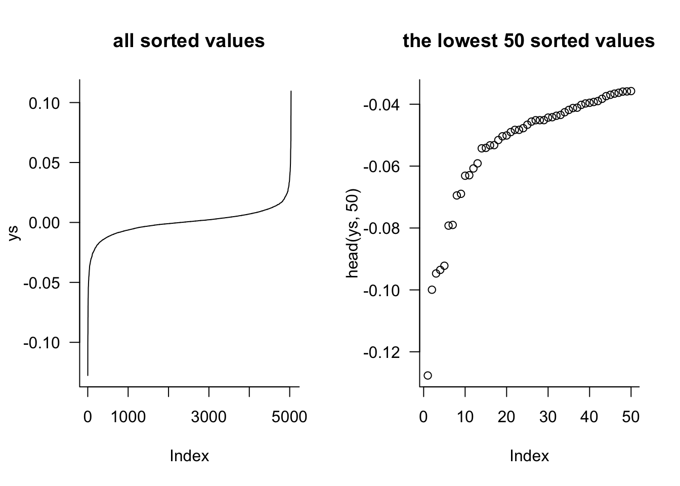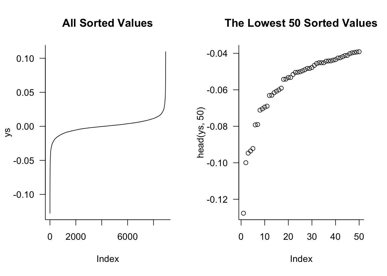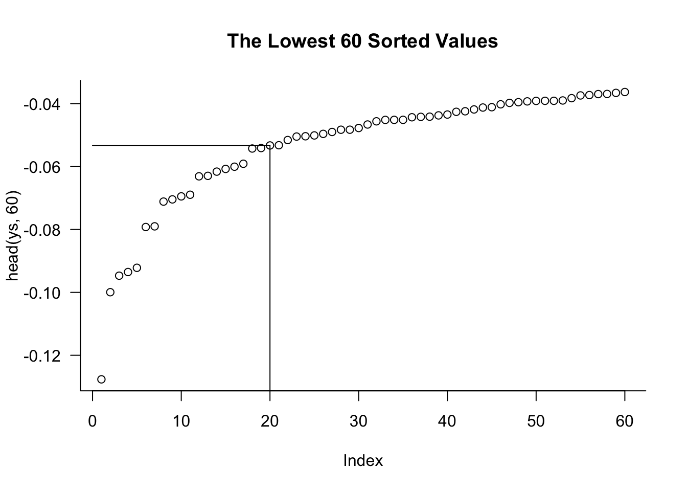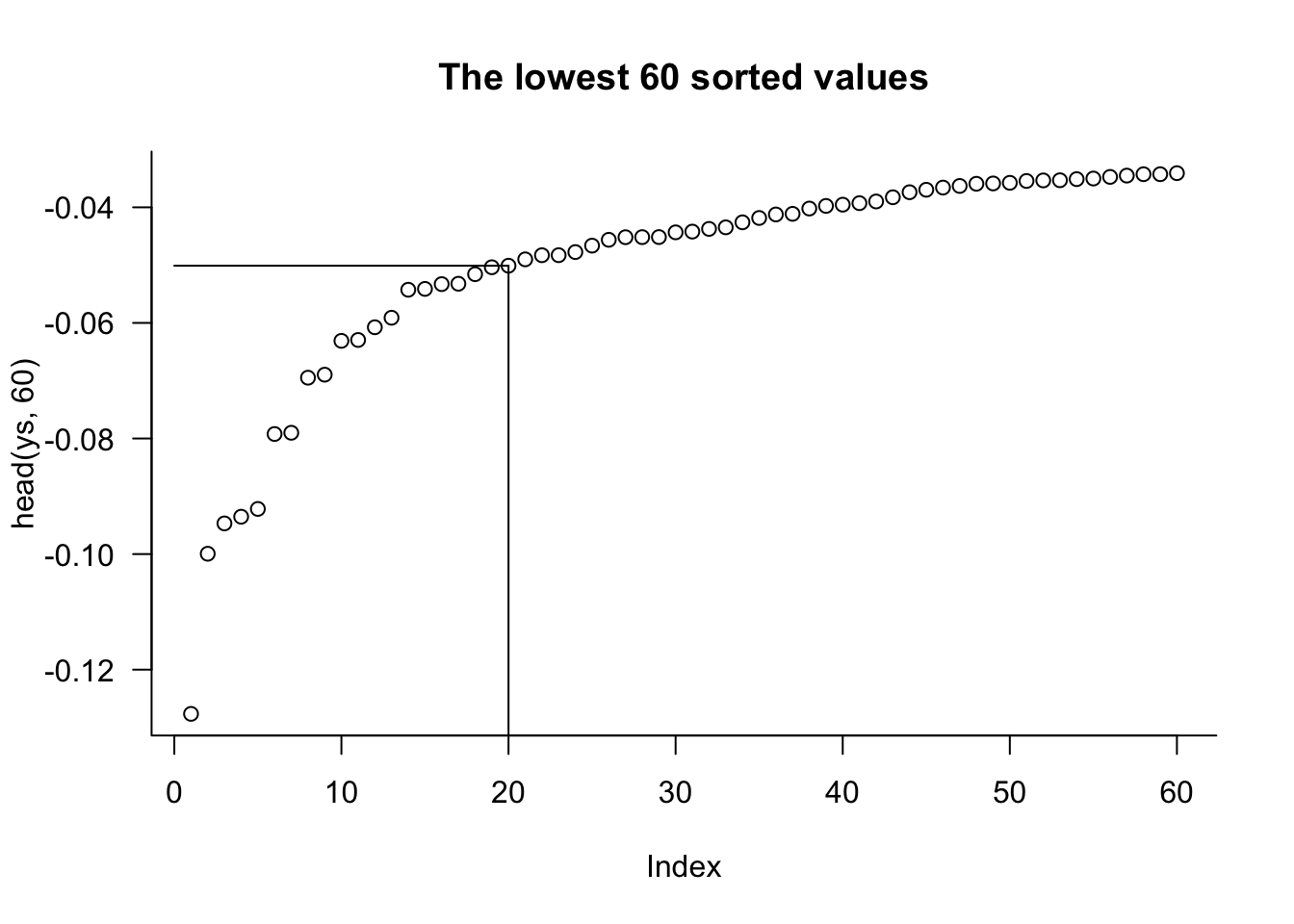 plot(head(ys,60),main="The Lowest 60 Sorted Values",las=1,bty='l')