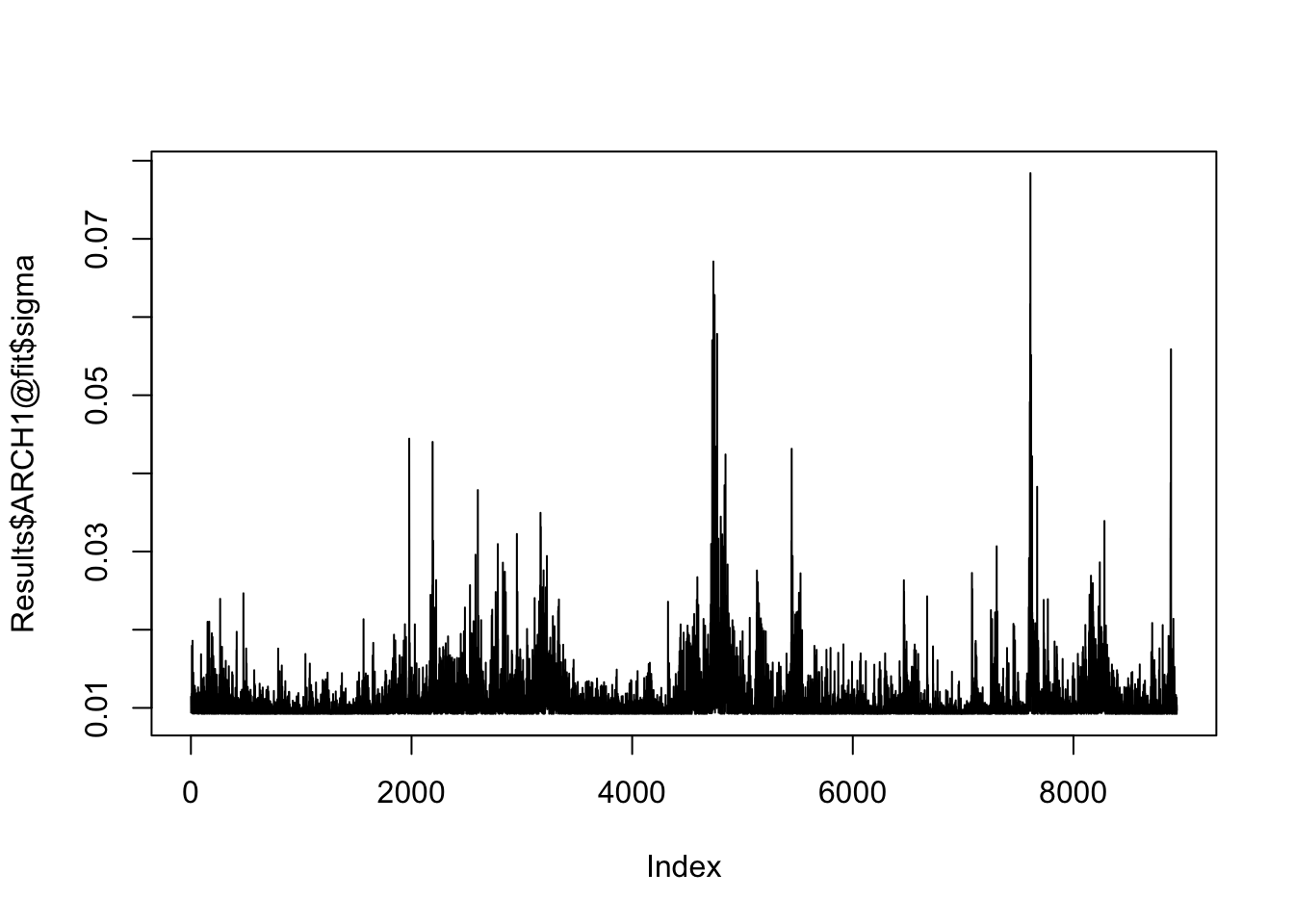 cat(" Likelihood of ARCH: ", round(likelihood(Results$ARCH1),1), "\n",