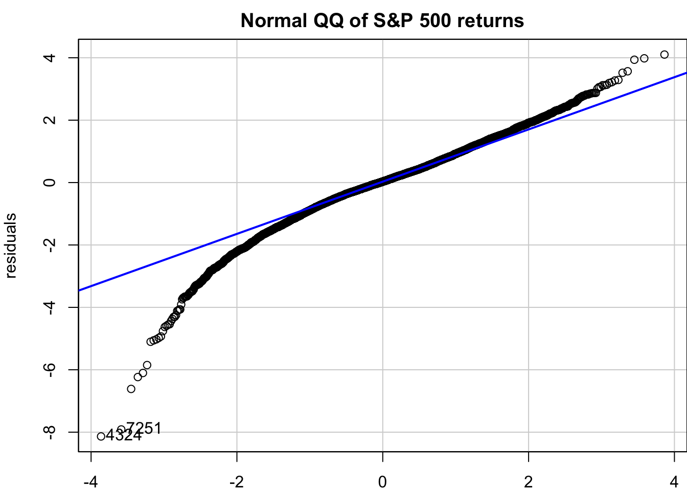 x=qqPlot(residuals, distribution = "norm", envelope = FALSE,main="Normal QQ of S&P 500 returns")