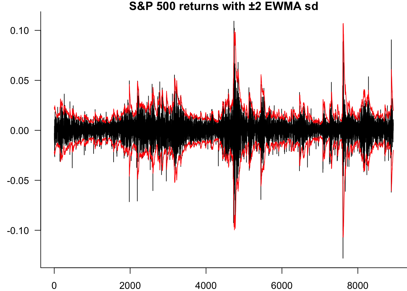 We estimate the in-sample EWMA volatility and plot the returns with ±2 standard deviation bands.